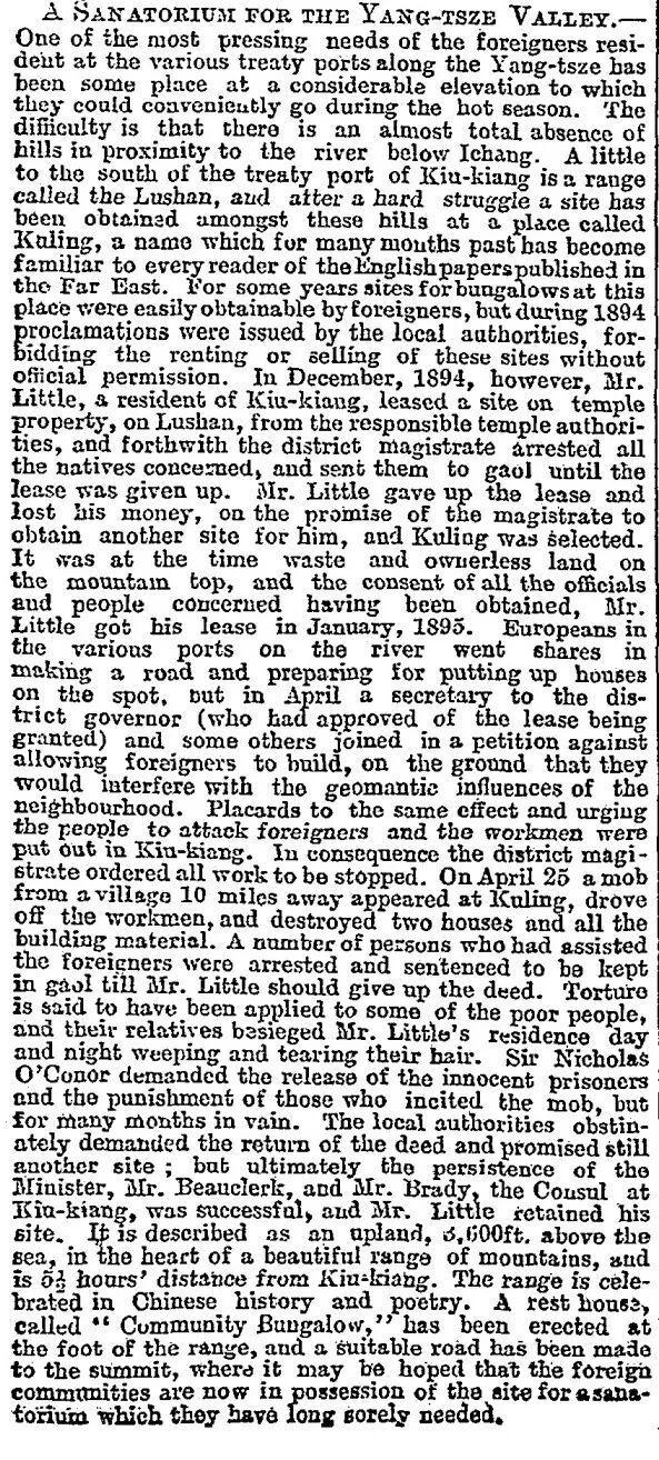 根据目前检索到的资料,这篇发表于1896年的文章,不仅是《》上首篇有关庐山的报道,也极有可能是欧美报刊中最早介绍牯岭避暑地的文字。