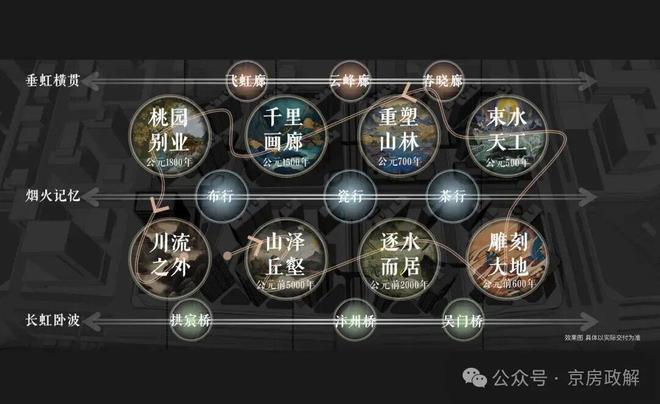 蜿蜒的大运河,穿越古今,以现代语言诉说运河历史,取意运河生长历程的八段篇章,串联大区故事。打造出长虹卧波、烟火记忆、垂虹横贯三大主题廊道;山泽丘壑、逐水而居、雕刻大地、束水天工、重塑山林、千里画廊、桃园别业、川流之外八大景观艺术馆。