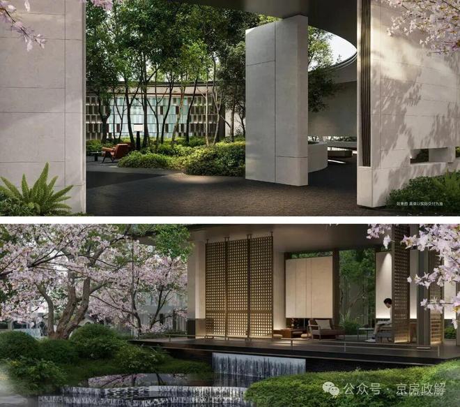 总宽约58米奢阔归家大门(仅0708地块,其他大门约36米),玫瑰金色金属+奢石+釉面陶板材质,对称水系形成中式礼序归家,奢华恢弘归家宛若步入艺术馆。